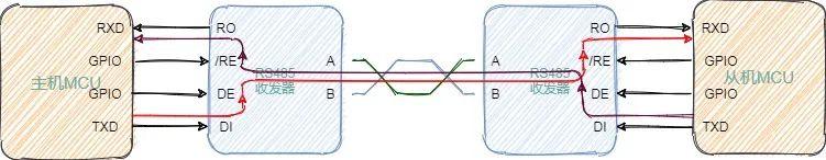主机的 GPIO 会控制 RS-485 收发器的 DE 管脚,设置发送模式,从 UART TXD 线向 RS-485 收发器的数据( D 或 DI )线发送一个字节,收发器将在 A 和 B 线上将单端 UART 位流转换为差分位流,数据离开收发器后,主机立即将收发器的模式切换为接收模式。