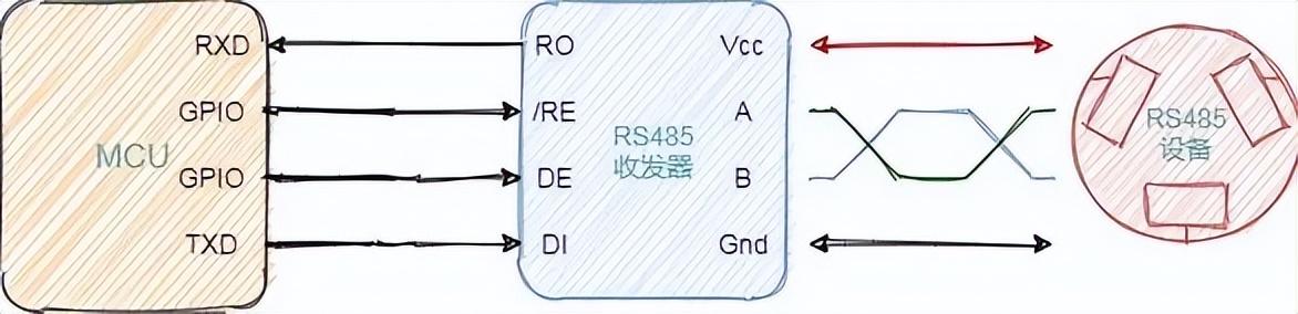 RS-485 是差分传输,如果用单片机控制 RS-485 接口的设备,需要用到 收发器 ,这一点和 CAN 总线是类似的,如下是一个 MCU 控制一个 RS-485 的图示。